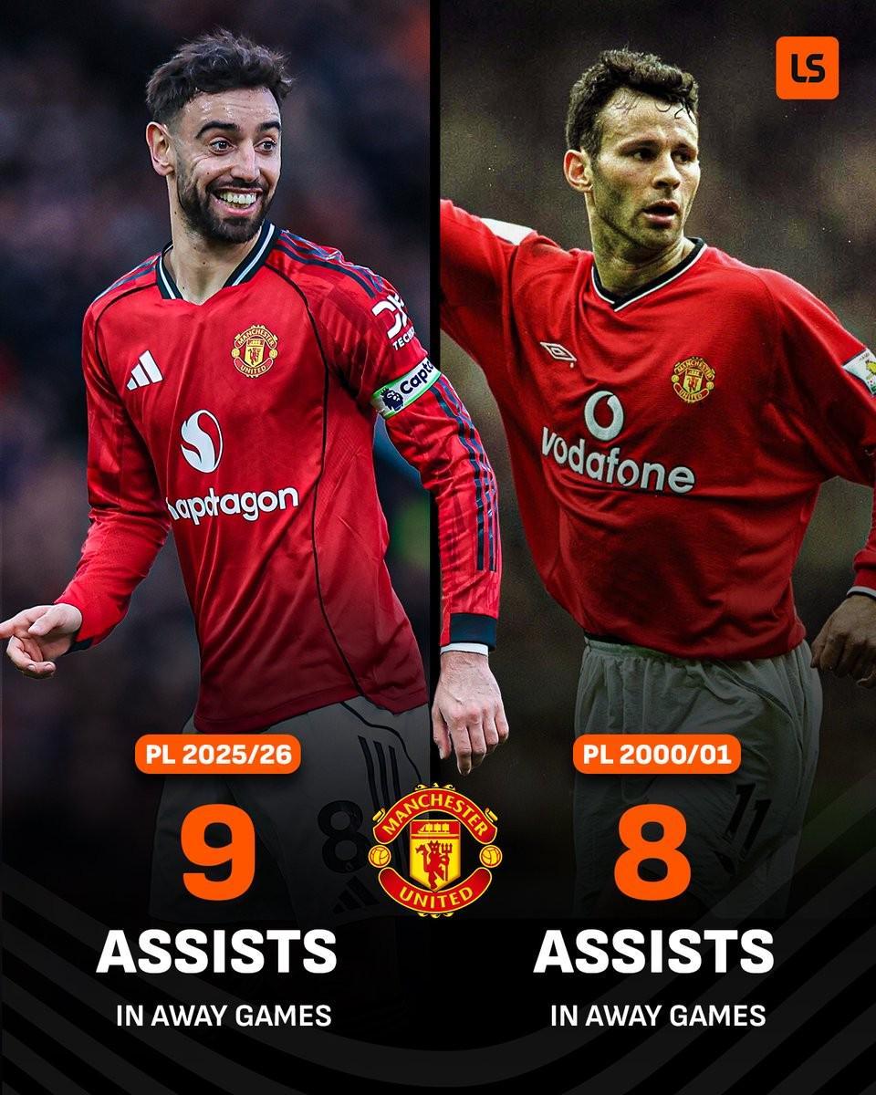 据统计,布鲁诺-费尔南德斯打破了吉格斯在2001-02赛季(8次)创下的曼联球员单赛季英超客场助攻纪录。